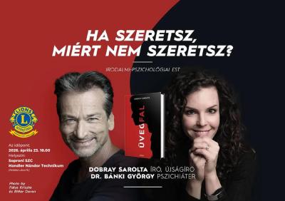 2026. április 03. 14:00 Ha szeretsz, miért nem szeretsz? - Dobray Sarolta és Dr. Bánki György irodalmi és pszichológiai estje a Sopron Lady Lions Club szervezésében